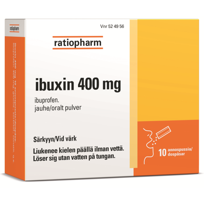 ibuxin 400 mg jauhe on tarkoitettu lievän tai kohtalaisen kivun ja kuumeen lyhytaikaiseen, oireenmukaiseen hoitoon aikuisille ja yli 12-vuotiaille (vähintään 40 kg painaville). Vaikuttava aine on ibuprofeeni, joka kuuluu steroideihin kuulumattomien tulehduskipulääkkeiden (ns. NSAID-lääkkeiden) ryhmään. Lääkemuoto: jauhe. Pakkauskoot: 10 ja 20 annospussia. Tutustu huolella pakkausselosteeseen. Itsehoitolääke.