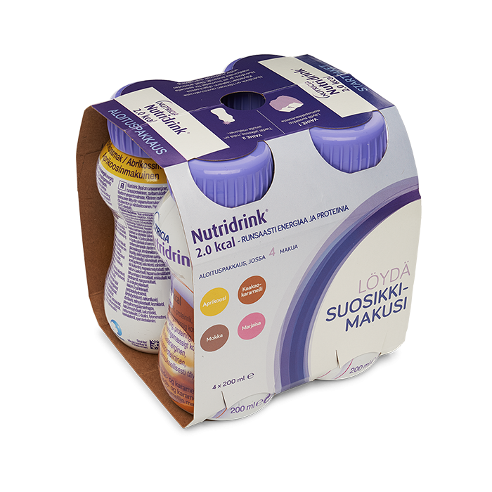 Nutridrink 2 kcal mixpack - kaikki neljä makua samassa pakkauksessa! Metsämarja, aprikoosi, kaakaokaramelli ja mokka. Nutridrink 2 kcal on kliininen ravintovalmiste, pirtelömäinen täydennysravintojuoma, joka sisältää runsaasti energiaa (400 kcal /plo), proteiinia (20 g proteiinia /plo) ja D-vitamiinia. Vähälaktoosinen, gluteeniton, halal.